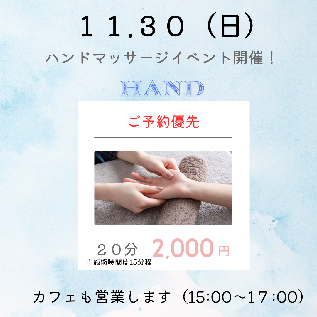 日時:11月30日 15:00~17:00 参加費:20分2000円(税込み、現金のみ)、別途ドリンク注文をお願いします 担当:siho(簡単な手話での対応可能) マッサージ時間は15分程度になります。マッサージ終了前後、カフェのご利用ができますので、1ドリンク注文をお願い致します。カフェ営業時間(15:00~17:00)