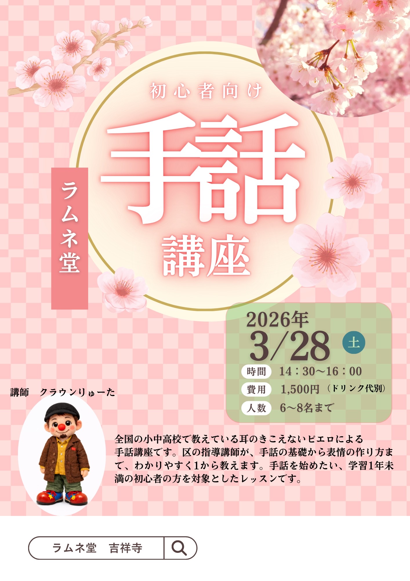 場所:吉祥寺らむね堂店内(貸切) 時間:14:30~16:00 参加費:1500円(別途ワンドリンク注文をおねがいします) 定員:6~8名程度 講師:クラウンりゅーた(ろう者) 手話をこれから始めてみたい人、学習歴1年未満の初心者のための手話講座です!
